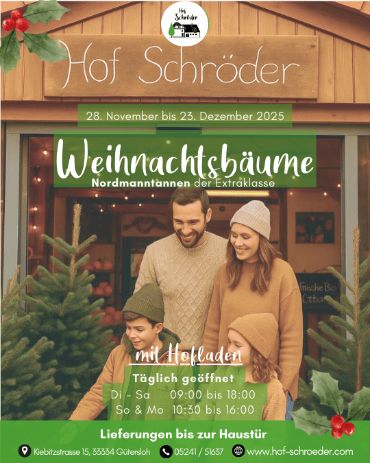 Wie gewohnt versorgen wir Sie mit hochwertigen Produkten aus der Umgebung. Und natürlich wartet eine große Auswahl an wunderschönen Weihnachtsbäumen auf Sie. Ihren Traumbaum liefern wir Ihnen gerne direkt bis vor die Haustür!